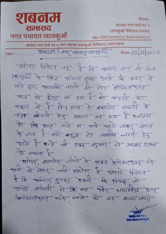 नगर पंचायत लालकुआं के आजाद नगर वार्ड नंबर–4 में नैनीताल दुग्ध उत्पादक सहकारी संघ द्वारा नाले में बहाए जा रहे दूषित एवं केमिकल युक्त पानी को लेकर क्षेत्रवासियों की परेशानी बढ़ती जा रही है।