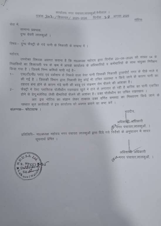 वहीं नगर पंचायत अध्यक्ष सुरेन्द्र सिंह लोटनी ने जानकारी देते हुए बताया कि इसी वर्ष 28 अगस्त को नैनीताल दुग्ध संघ को पत्र भेजकर दूषित पानी की समस्या के समाधान के निर्देश दिए गए थे। लेकिन अब सभासद द्वारा पुनः पत्र भेजा जाना यह दर्शाता है कि अब तक समस्या का समाधान नहीं हो पाया है, जिससे क्षेत्रवासियों को भारी परेशानी का सामना करना पड़ रहा है।