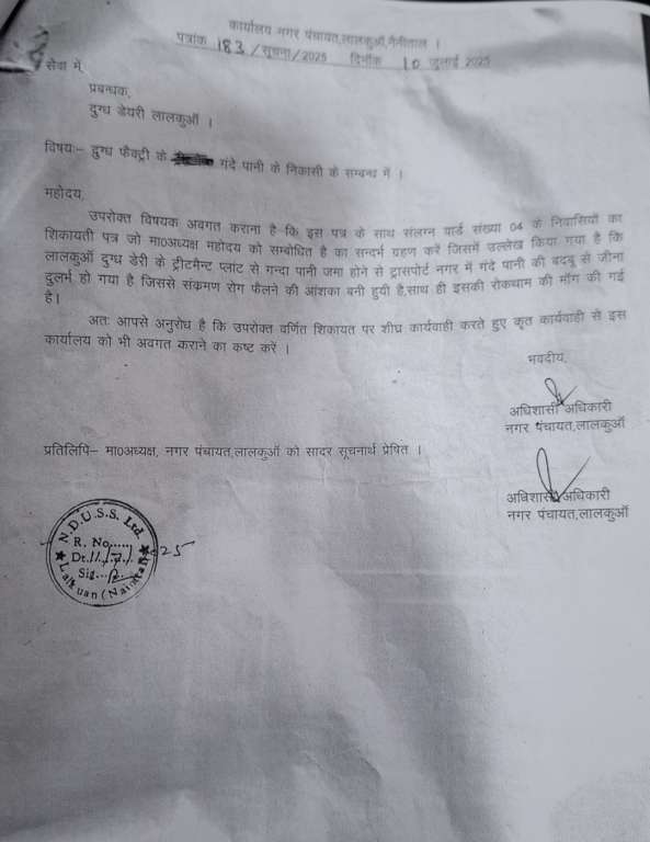 सभासद शबनम ने पत्र में बताया कि दुग्ध संघ से निकलने वाला गंदा और केमिकल युक्त पानी नाले के माध्यम से वार्ड में फैल रहा है, जिससे क्षेत्र में दुर्गंध के साथ-साथ जल जनित बीमारियों का खतरा लगातार बढ़ रहा है। उन्होंने नगर पंचायत अध्यक्ष से इस समस्या के स्थायी समाधान हेतु तत्काल आवश्यक कदम उठाने की मांग की है।